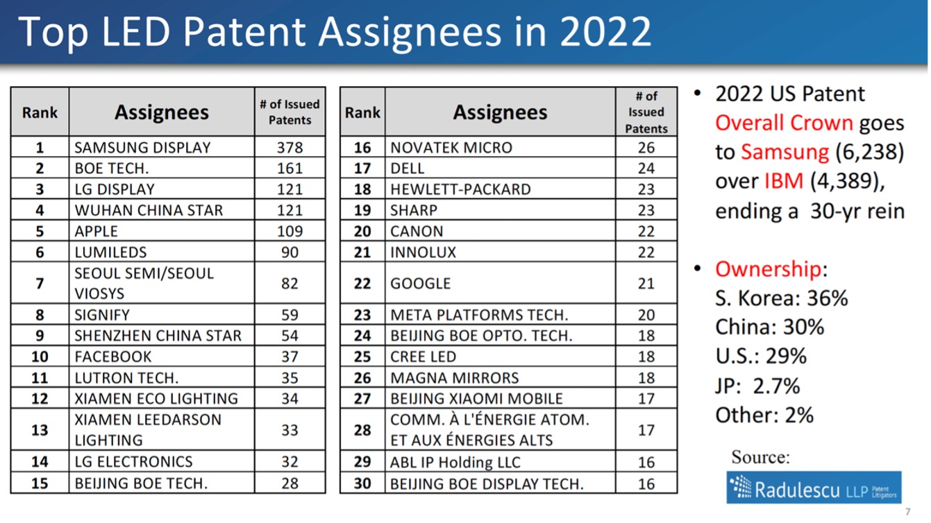 Most of the LED patent assignees in 2022 rest in the display/mobile device realm including top-of-the-heap Samsung with 378 patents. While most of the patents were assigned to firms more closely aligned to displays, tablets, and smartphones, the top 30 lighting companies in 2022 continued to include LumiLeds, Seoul Semi, Signify, Lutron, Shezan China Star, Xiamen Eco Lighting, Xiamen Leedarson Lighting, and Cree, in that order, with IBM, Hubbell, and LEDVANCE dropping out of the top 30. Notably, the 2022 U.S. Patent Overall Crown went to Samsung, ending IBM’s 30-year reign of the top grantee.